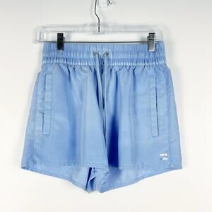 Billabong Sol Searcher womens shorts in light blue. Relaxed fit. High waist. Side pockets. Stretchy elastic waist topped with a drawcord for an extra secure fit. Size small. Excellent used condition. No flaws detected. See measurements for proper fit.
