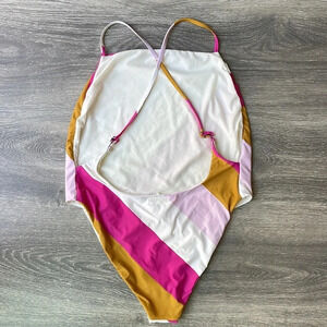 A swimsuit that speaks to your sun-drenched soul. Rock summer tan lines in gold, sun-bleached white and bold pink in the Soul Stripe One Piece. Bringing back a retro high cut leg, the striped one piece swimsuit features a clean silhouette with a straight neckline and cross back straps.