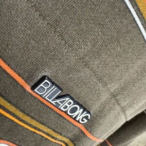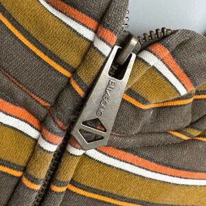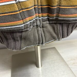 Stylish and warm puffer jacket. Features brown and yellow stripes. Perfect for outdoor fun.