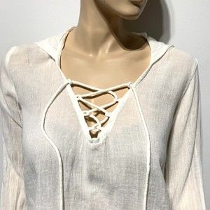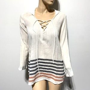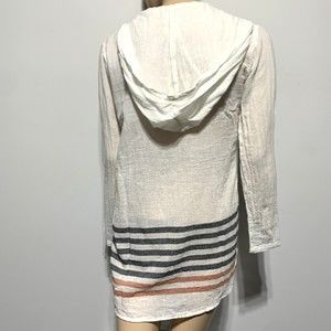 Billabong Tunic Hooded Lace Up Gauze Top Long Sleeve Cream Stripe Size M Medium