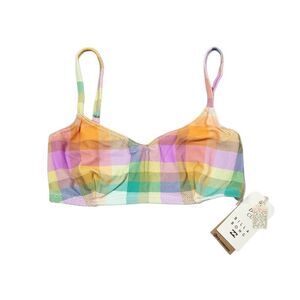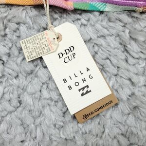 Women's Billabong Warm Waves Lila underwire swim bralette bikini top in pink multicolor plaid. New with tags, but has a couple missing stitches from the front as shown in photo. Women's size medium, D-DD cup.