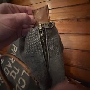 Features a sturdy charcoal-gray canvas body, embroidered lettering, and tan faux-leather double handles. Full-zip top closure and inside zip pocket.