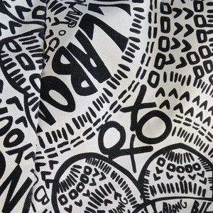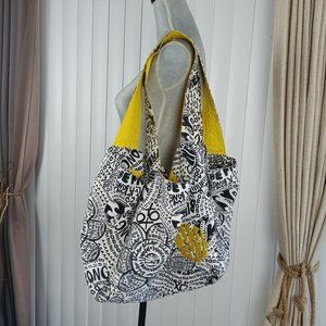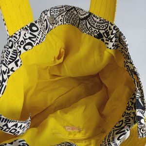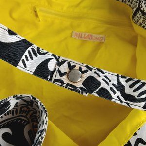 Adorable black and white fun flowers and letters pattern with yellow lining and handles. Billabong logo embroidery on front bottom. Little rust on inside snap button. Very good pre-owned condition.