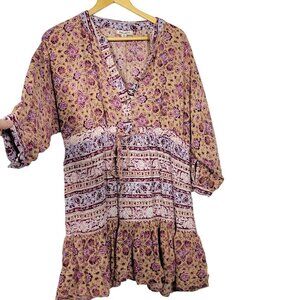 Billabong Women's Boho Marry Mine Taupe/Magenta Floral Mixed Rayon Dress Size S