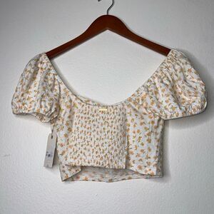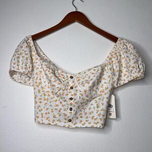 Cropped top Fitted silhouette Sweetheart neckline Short sleeves Faux buttons down front Smocked back AC 0894