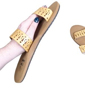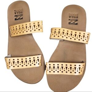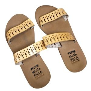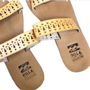 Billabong Slip on Sandals. Light tan strap color with darker tan footbed. Rounded toe shape. Double straps. Tribal, coastal cut out detail in straps for added style. Padded sole. Size 8 (No size listed but measures as an 8; see measurements below). Really good preloved condition. No flaws.