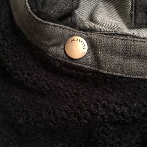 Boho intentionally distressed mixed fabric black jean jacket. Sweater sleeves and hood. Hood is detachable. Very lightly worn. Sold out everywhere.