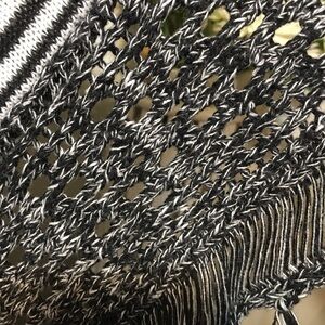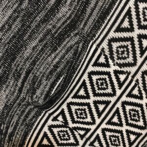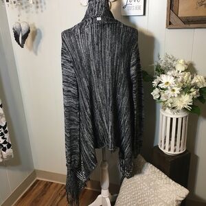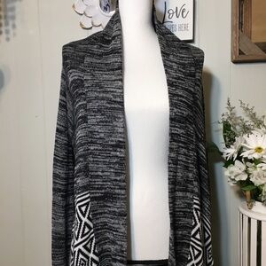 Angle hem long sleeve knit shrug. Tribal pattern knit border with two side pockets. Perfect go to throw on knit. Gently preowned condition.