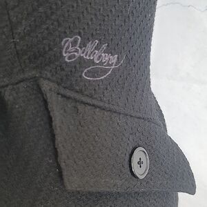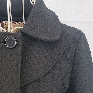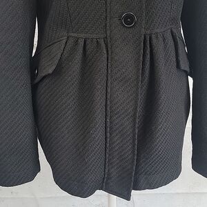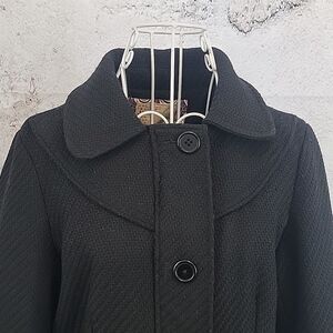 A rayon wool blend basketweave knit peacoat by Billabong with a zip and button front closure, flap pockets, and fitted at the waist with a skirt hemline. Great pre-owned condition with normal signs of wash and wear.