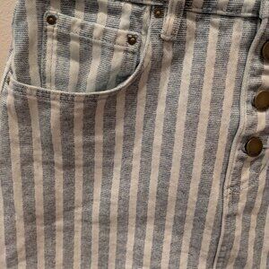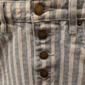 This striped mini skirt is 100 percent cotton. Button up, pockets in the front and back. The blue stripes have a cool distressed look to them.