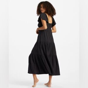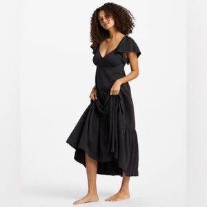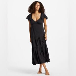 Discover the Last Light Dress from Billabong's A Sunset Away collection. This V-neck dress features flutter sleeves, a fitted bodice, and a breezy skirt. Made with cotton viscose slub fabric, it includes tiered ruffles and smocking at the back for a perfect fit.