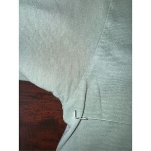 Lightly used. The only flaw is a stain under the arm of the shirt. Blue gray colored. Armpit to armpit laid flat measures about 18 inches.