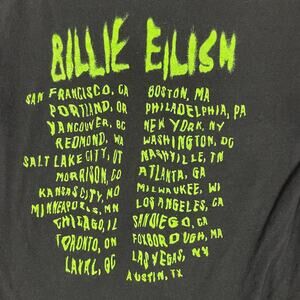 Design: Double-sided print—front features Billie Eilish graphic; back features tour cities in neon green text.