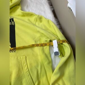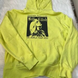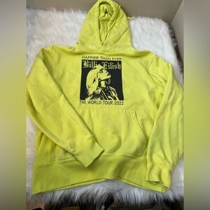 Bright yellow hoodie featuring Billie Eilish World Tour 2022 graphic.