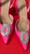 Elevate your look with these elegant fuchsia satin heels. Featuring a stunning crystal embellishment, these shoes are perfect for any special occasion. These are in excellent condition.