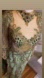 Elegant mint green dress with intricate gold embellishments. Features sparkling rhinestone details and floral patterns. Perfect for weddings.