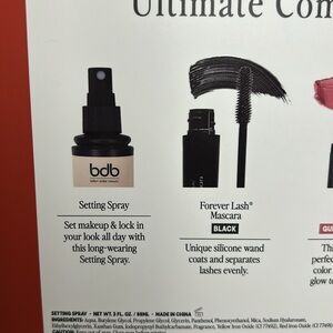 This set includes a setting spray, mascara, cream blush highlighter stick, and contour stick brush.