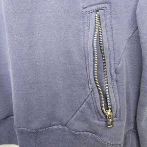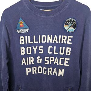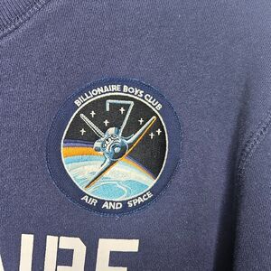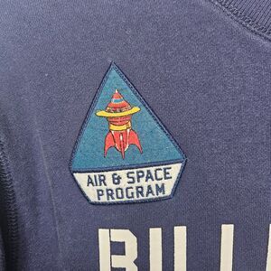 Stylish blue sweatshirt with bold white lettering. Features unique patches. Comfortable and trendy.