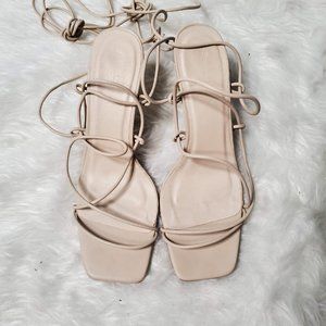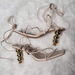 triple tiered bubble sculptural heel | open square toe | thin, tubular toe strap | crossover straps across vamp | wrap around lace up ankle fastening | exposed heel counter | synthetic upper, lining and outsole