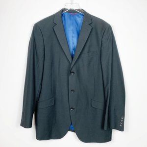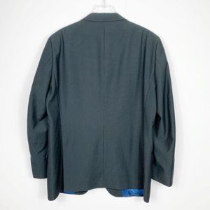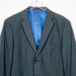 Billy London UK 2 piece suit charcoal gray with subtle pinstripe. Jacket: 3 button close, notched lapel with buttonhole, left breast pocket, 2 faux front flap pockets, 4 kissing button sleeve, double back vent & fully lined. Pants: flat front, 2 front pockets, 2 back button pockets & zip, bar & inner button close. In excellent condition. Smoke Free Home