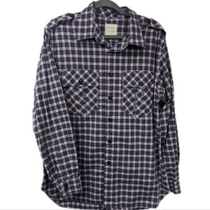 This shirt is in gently used condition. It is 100% cotton. It was made in Italy. The material is grey, white, and red plaid. It gives the white area a pinkish tone. The material has a micro texture to it. The shoulders have a tabbed detail that is able to be unbuttoned. Please see photos for details.