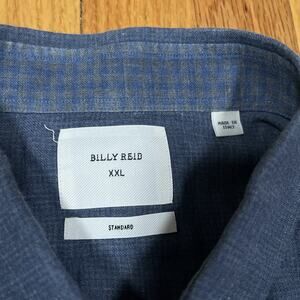 Nice soft to touch cotton button up from Billy Reid in a size 2XL with a sort of micro crosshatch plaid blue pattern, made in Italy. But note it has flaws: two holes in one sleeve that are documented in the photos. See pictures for details and measurements. Orders ship out on Monday, Wednesday, and Friday.