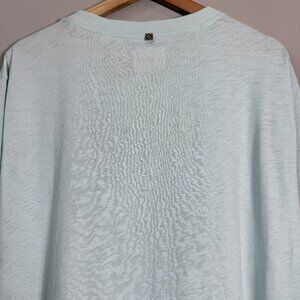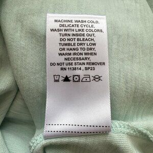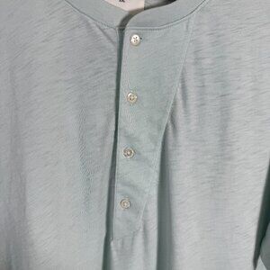 The Billy Reid Short Sleeve Organic Cotton Henley Tee T-Shirt in size XXL is a stylish and comfortable option for men. Made of solid pale blue knit cotton, this shirt features a Henley neckline and button accents. With a regular fit, this tee is easy to care for with machine washable fabric, making it suitable for all seasons. The shirt also includes a logo accent and is perfect for a beach or outdoor theme, showcasing a mix of nature, designer, and preppy styles. Color is called pale blue, however, in person it looks more similar to a light mint green.
