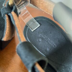 Gorgeous sandals by Southern designer label Billy Reid. Made in Italy. Clean, minimalist style in black suede leather ft adjustable ankle strap and stacked block heel. Heel height 3.25“. Size 9, excellent preowned condition.