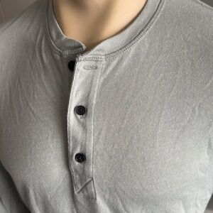 Billy Reid light moss long sleeve henley. This classic henley style is knit from 100% cotton in a soft, slub texture that feels lightweight and airy, making it a perfect piece to layer with now, and wear on its own as the weather heats up. It’s finished with a band collar, trochus buttons, and an underplacket. Rolled hem. Medium. See last pic for size chart. Nonsmoking home.