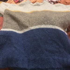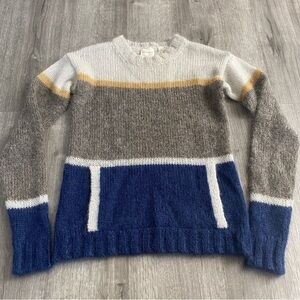 Stay cozy and stylish with this colorblock sweater featuring shades of blue, gray, and cream. Perfect for any casual outing. Has a kangaroo pouch. Excellent condition. Other than two tinnnny spots shows in pics, you can’t even see them unless you are looking my for them.