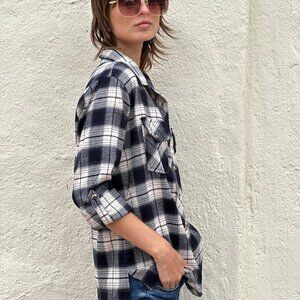 The Swift Plaid Shirt, in a classic Black/White/Grey plaid with button-front pockets and button sleeves