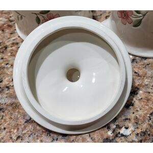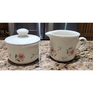 The Biltons Sugar & Creamer Set is a stylish and functional addition to any dining table. This set includes a creamer and sugar bowl, making it easy to serve cream and sugar together for coffee or tea. The sleek design and durable construction make it a practical and attractive choice for everyday use or special occasions. Enhance your dining experience with this practical and elegant creamer and sugar set. The set has beautiful pink flowers.