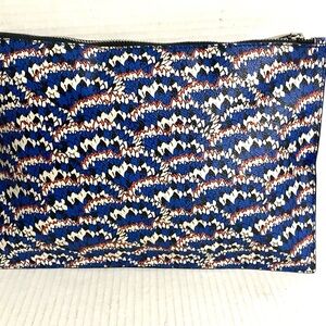 Stylish clutch with a vibrant blue and white pattern. Features a secure zipper closure.silver tone hardware logo at front hight 8” wide 12”