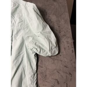 This Bimini Bay Outfitters LTD men's button-up fishing shirt in size XXL is perfect for travel and casual occasions. Made of 100% nylon and polyester fabric, it features a collared neckline, short sleeves, and button-up closure with a point collar style. The shirt is machine washable and comes in a solid green color with embroidered accents and a vented design that adds to its fisherman character.