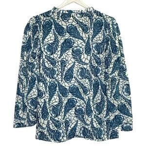 Bindu XS Laurie Top In Blue Feather Print 100% Cotton Ruffle Peasant Cottage