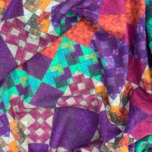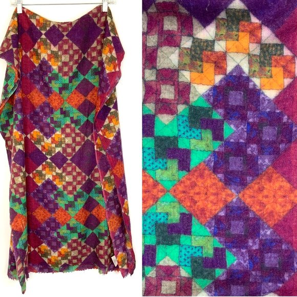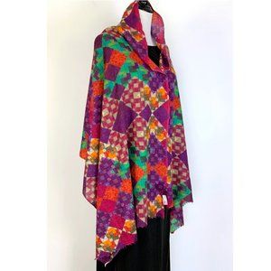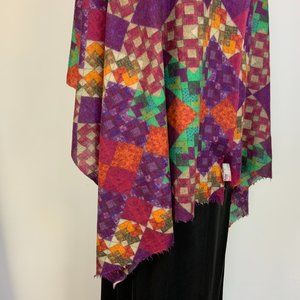Bindya New York Cashmere and Silk Scarf/Wrap. Multi colored, geometric square pattern. Measurements: 27 inches wide x 76 inches long, 55% cashmere and 45% silk, fringe edge. Dry clean. Good pre-owned condition, clean. Smoke free hone. Bundle discount.
