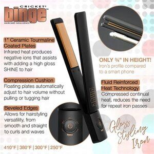 -MAXIMIZE STYLE – Create masterpieces with the Cricket Binge Gloss Styling Iron. In a minimalistic design, this sleek, ultra-slim (only .75" height) hair styling iron produces a high gloss shine with less heat time. From the creator of the original and best selling Static Free Fast Flo brush, you'll love Cricket's new must-have Binge Styling Iron!