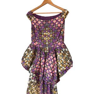 This stunning African print top features a unique hi-low peplum design, with a shorter front and elegant long skirt in the back. Made from vibrant real wax fabric (100% cotton), it has a bold purple, pink and gold geometric pattern. It closes with a back zipper and has short cap sleeves.