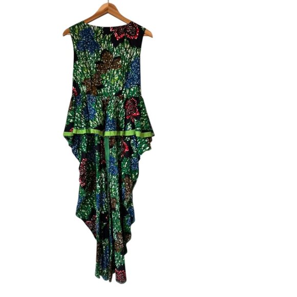 Keywords: African print, wax print, ankara top, peplum top, hi-low top, long back top, African fashion, Binta wax, size XL, women's clothing, ethnic fashion, bold print, formal top, party top, statement piece, Africa, tribal, top with skirt attached