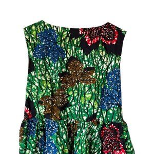 This stunning African print top features a unique hi-low peplum design, with a shorter front and elegant long skirt in the back. Made from vibrant real wax fabric (100% cotton), it has a bold blue, green and red geometric pattern. It closes with a back zipper and has short cap sleeves.