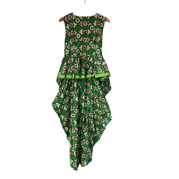 This stunning African print top features a unique hi-low peplum design, with a shorter front and elegant long skirt in the back. Made from vibrant real wax fabric (100% cotton), it has a bold green and red geometric floral pattern. It closes with a back zipper and has short cap sleeves.