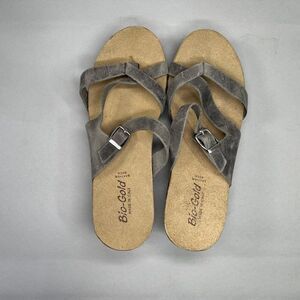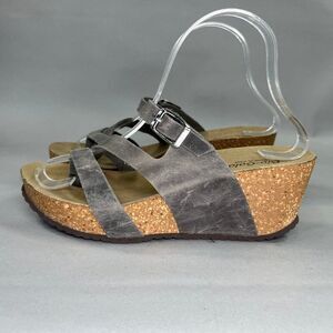 Bio Gold sandals women's gray wedge cork leather bohemian comfort strappy slip on sandals in excellent gently used condition!