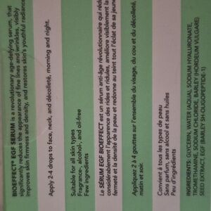 Imprinting Hydrogel mask with hyaluronic acid, and EGF serum: A groundbreaking and award-winning biotech serum that helps prevent and target signs of skin aging while enhancing moisture levels. Formulated with only 7 pure ingredients, including our signature BIOEFFECT EGF (Epidermal Growth Factor), a skin-rejuvenating signaling protein that helps support skin’s natural production of collagen to keep skin looking smooth and healthy.