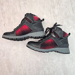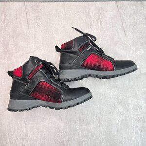 FEATURES/ACCENTS: Ankle style. Round toe. Comfort, cushioned footbed. Black and red color, plaid pattern. Lace up closure.