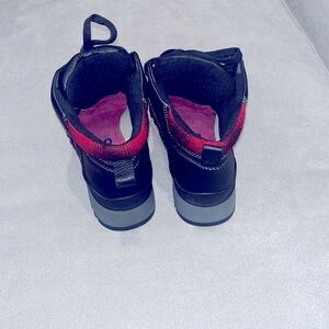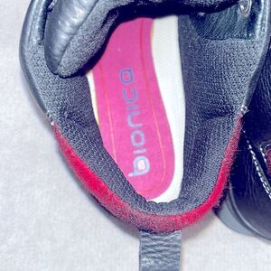 Bionica black leather all weather hiking boots w/ plaid flannel insets. 1.5” heels.
