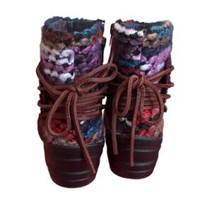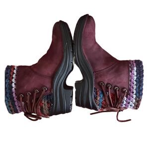 Bionica maroon leather boots with colorful ankle woven design , zip closure , textured grippy rubber soles