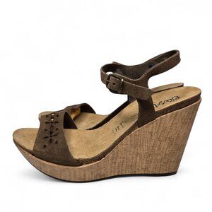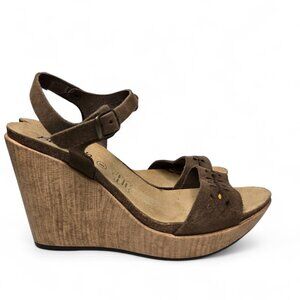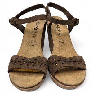 Biostep Taupe Suede Wedge Sandals Women's Perforated Floral Pattern Buckled 8.5