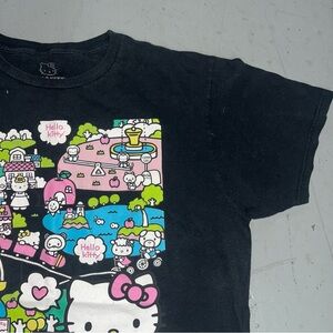 Charming black t-shirt with Hello Kitty graphic. Features vibrant colors and playful design.