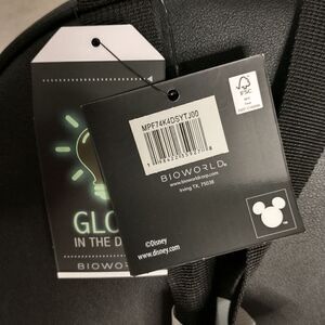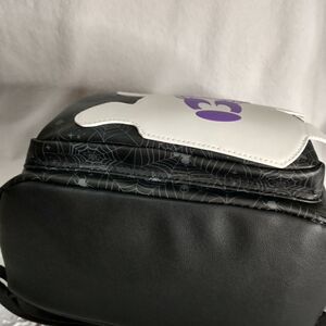 Black faux leather feeling fabric with spider web design on the outside. The Mickey ghost has a crease that looks like a smirk and a very light small dot on the left ear. Inside fabric is plain black polyester. Nylon straps are very simple and adjustable. No other issues than those mentioned. Smoke free/Dog friendly home.