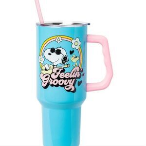 Stainless steel tumbler with Snoopy and 'Feelin Groovy' design. Features a pink handle and straw.